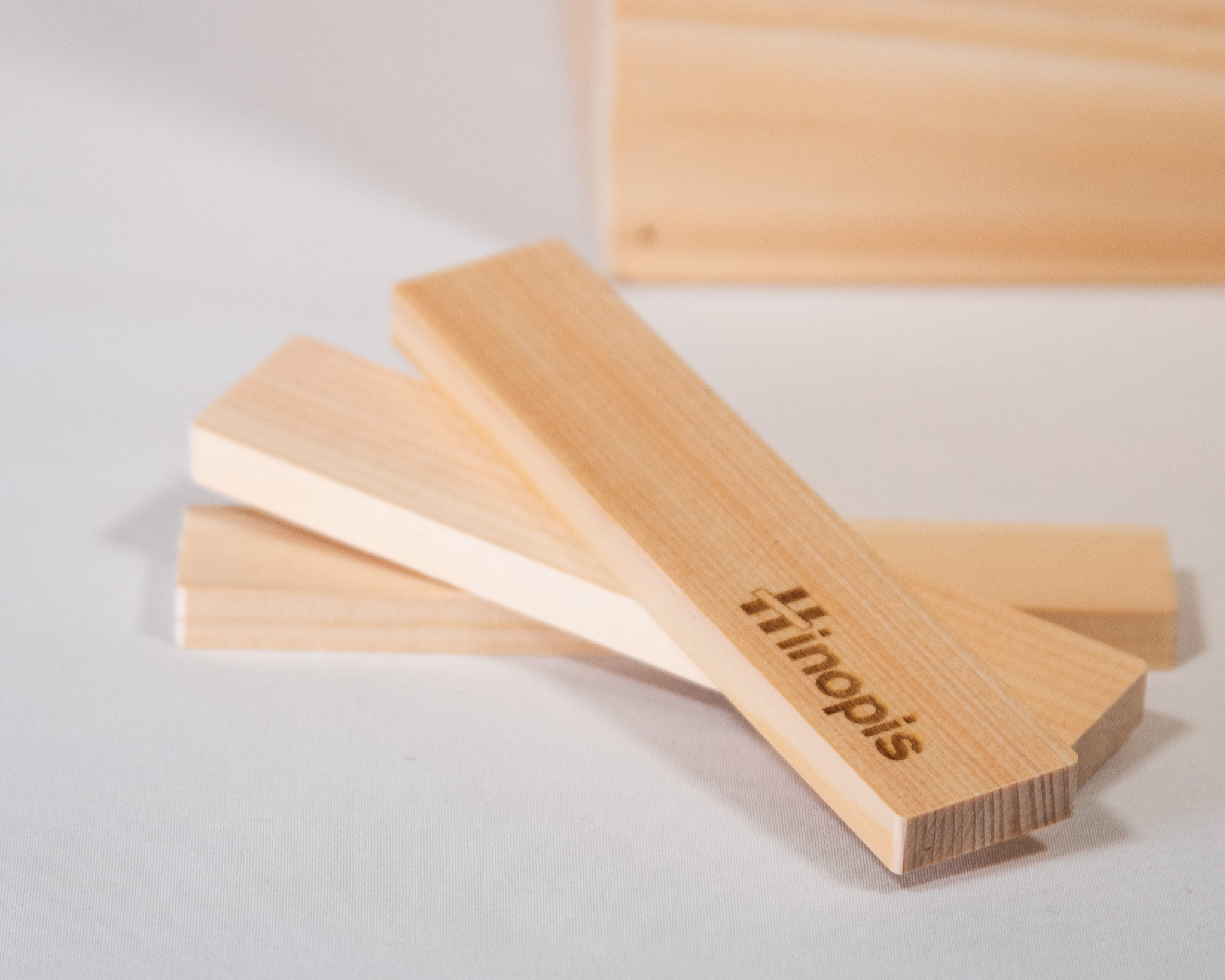 Hinopisは「8mm×24mm×120mm」の短冊型で製作しており、塗装をせず接着剤も使用していない100%天然無垢の木のままですので、安心して子どもに与えることができます。